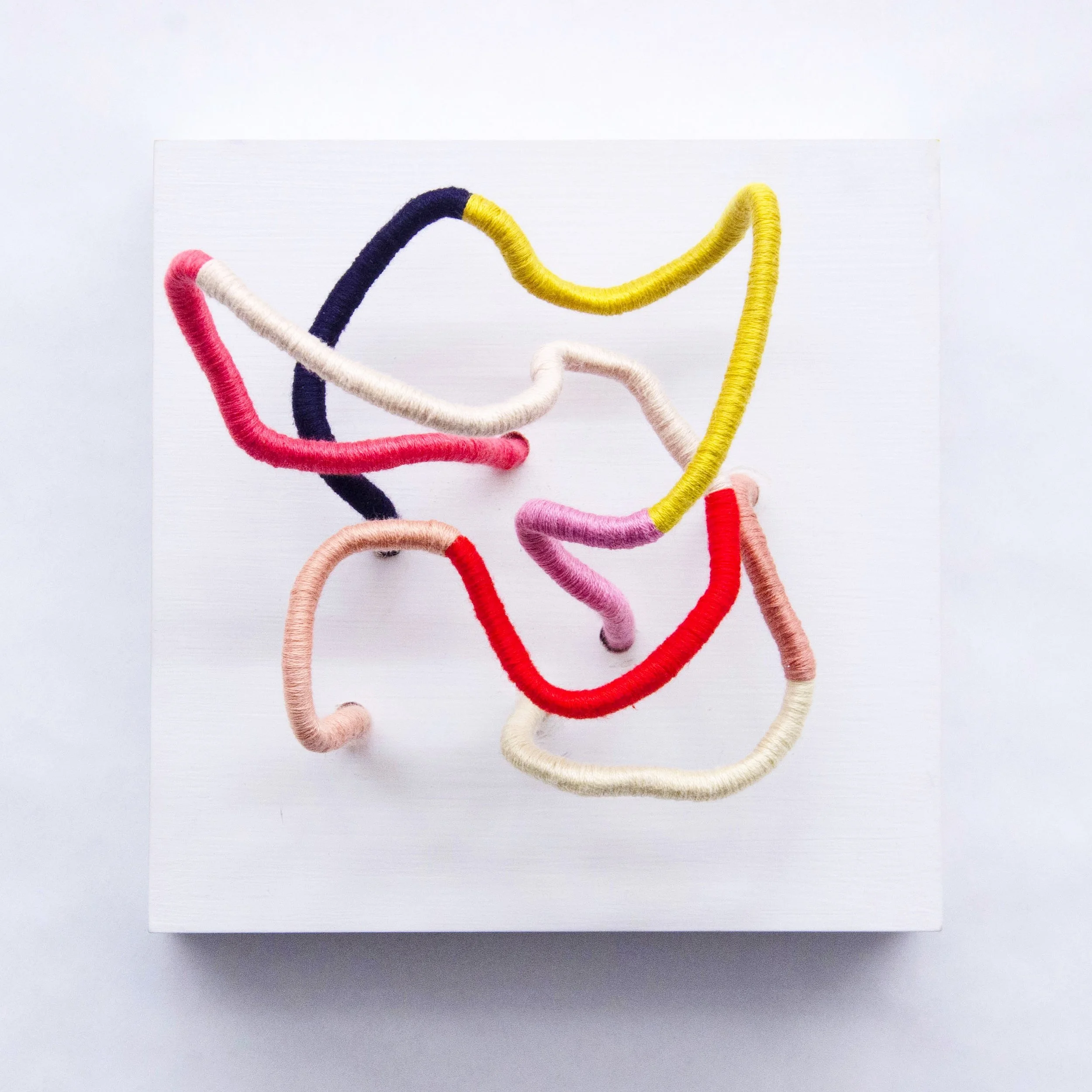 Fiber wrapped nylon and wire on acrylic painted wood panel.